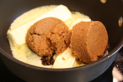 Combine 1 cup butter and brown sugar in a saucepan.